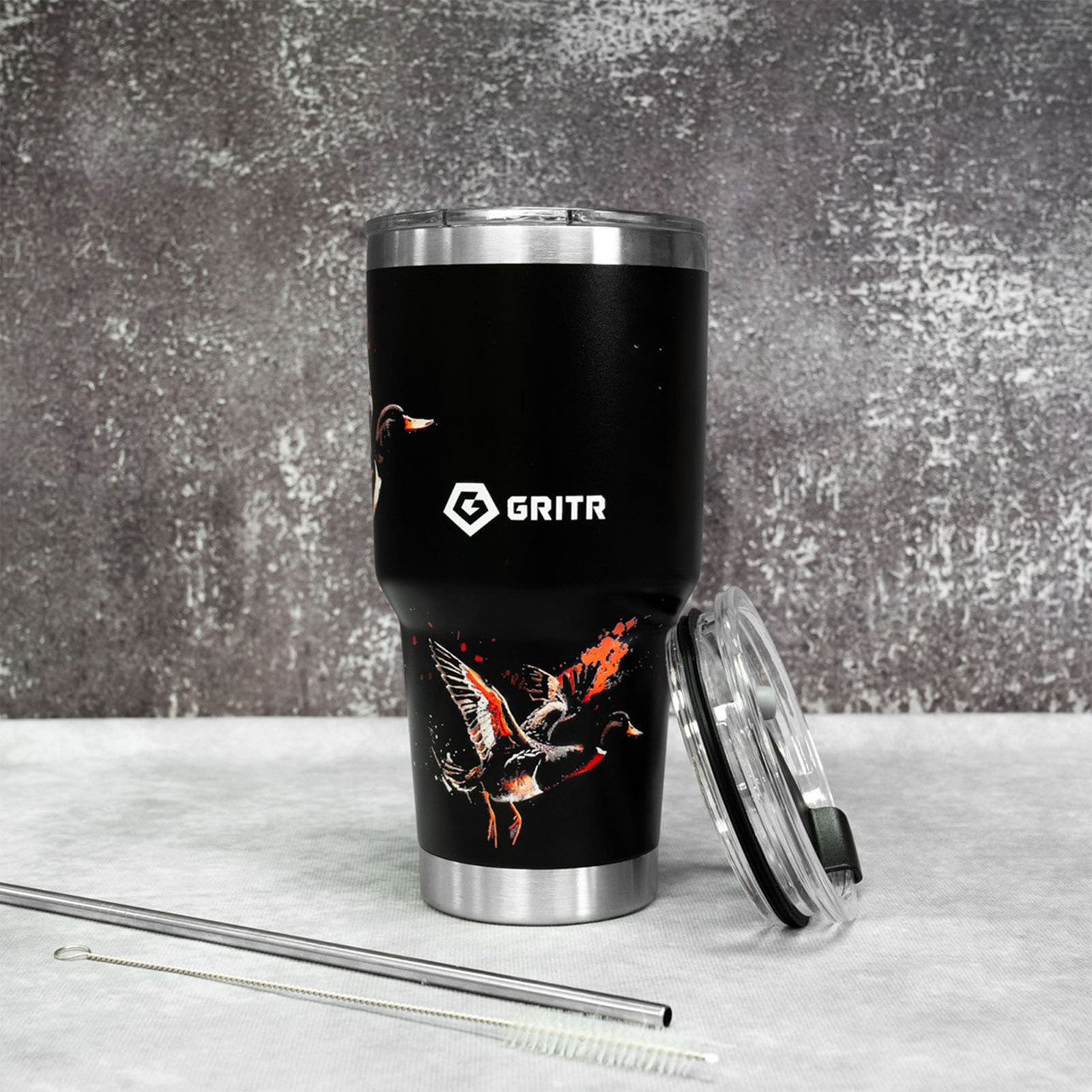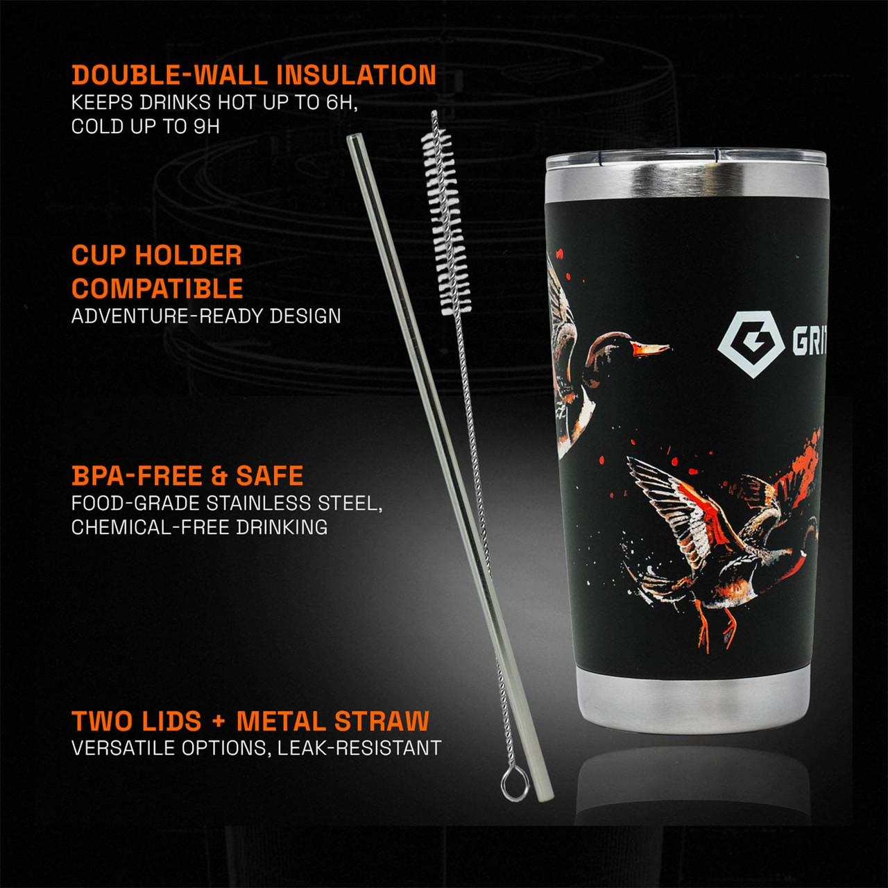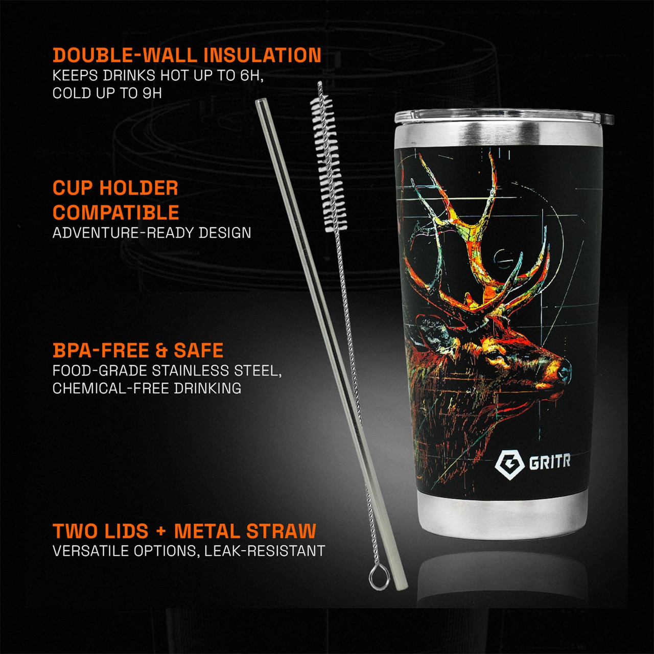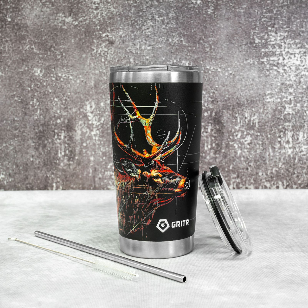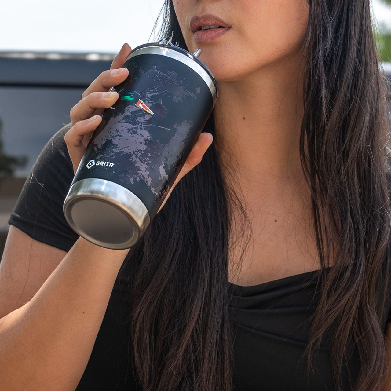 From the office desk to the mountain trail - the GRITR Stainless Steel Tumbler has you covered. Available in 20oz and 30oz sizes and designed for hot and cold drinks, this tumbler cup keeps your coffee steaming for up to 6 hours and your water ice-cold for up to 9, making it perfect for commutes, workouts, road trips, or outdoor adventures.Rugged, versatile, and ready for anything - the insulated tumbler features a 304 stainless steel interior and 201 stainless steel exterior, handling bumps, drops, and daily use with ease. The BPA-free lids and reusable metal straw give you multiple sipping options, while the wide mouth makes adding ice, fruit infusers, or cleaning effortless.